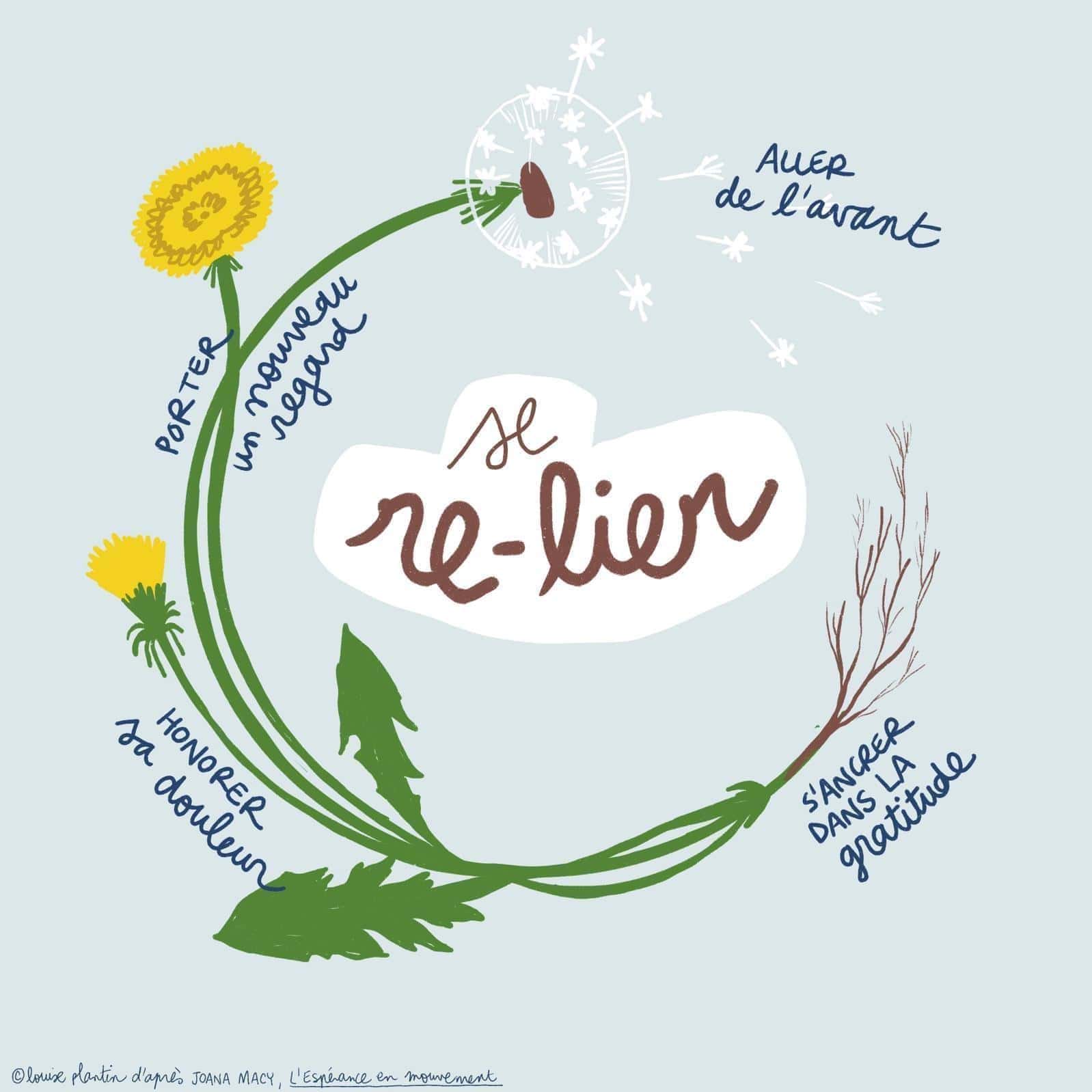 Nomades des Terres a à cœur de créer du lien avec quel que vivant que ce soit en choisissant la posture la plus adaptée. Le Travail qui Relie aide à sentir et choisir quelles pensées et quels comportements chacun, chacune souhaite adopter. En plus, il prend soin de l’eco-anxiété présente de nos jours. Luna et Solène passent à merveille le message de Joanna Macy.